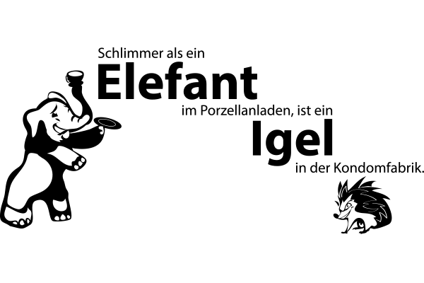 Dieser humorvolle Wandspruch „Schlimmer als ein Elefant im Porzellanladen, ist ein Igel in der Kondomfabrik“ sorgt für Lacher und ist dank freistehendem Motiv individuell gestaltbar. Auch für Rauhfaser geeignet.